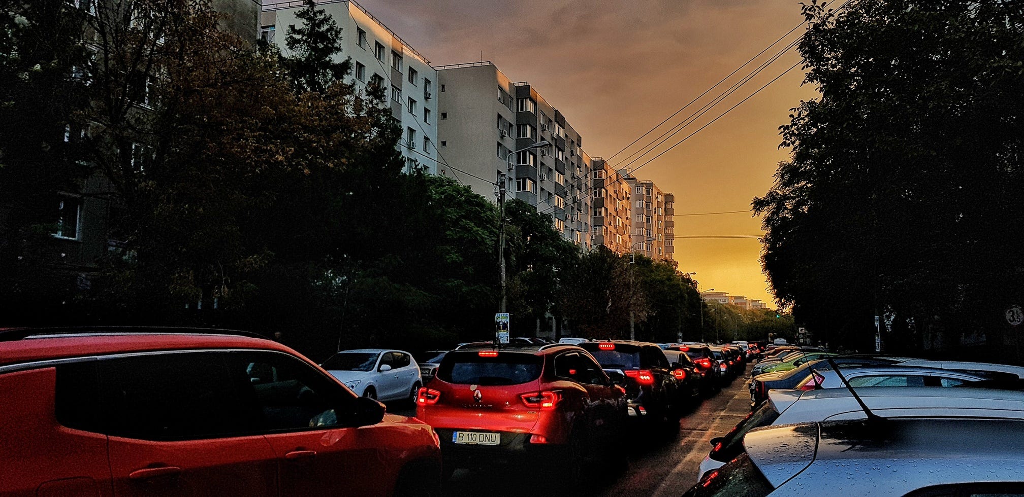 Evening does the opposite: it gathers edges, darkens facades, and lets windows and tail lights carry more of the scene than they should.
