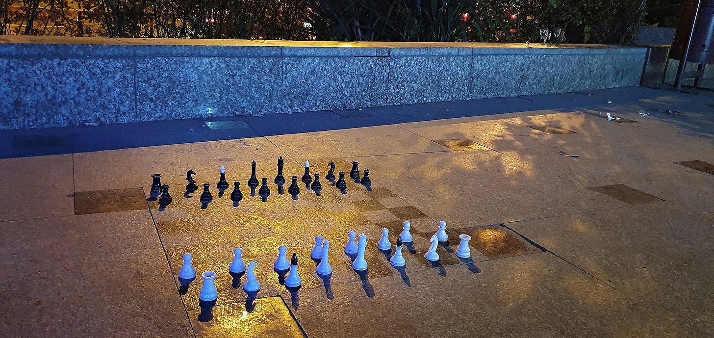 A transient and improvised chessboard gone before the evening is over. A rose burns brightly for a moment and is gone. A house settles into a slower rhythm altogether, carrying years in its walls, railings, cracks, and improvised signs of care.