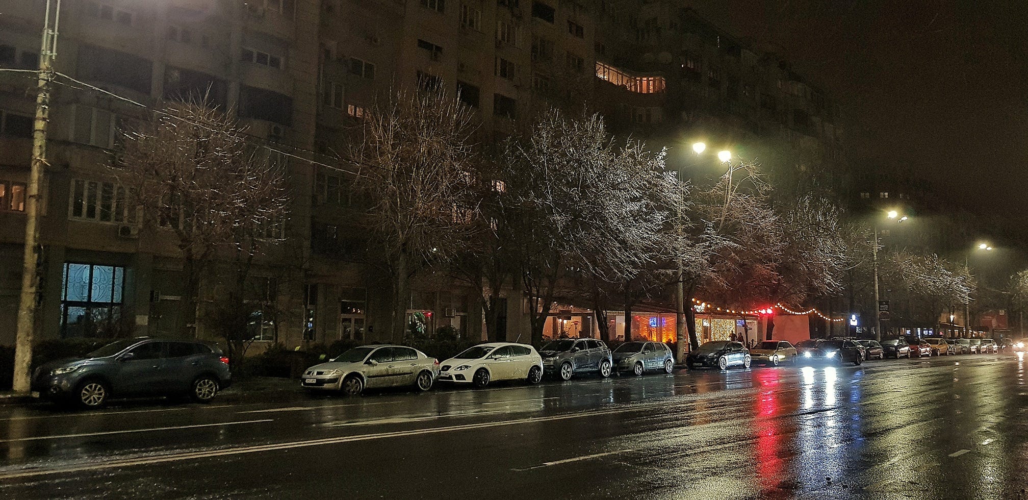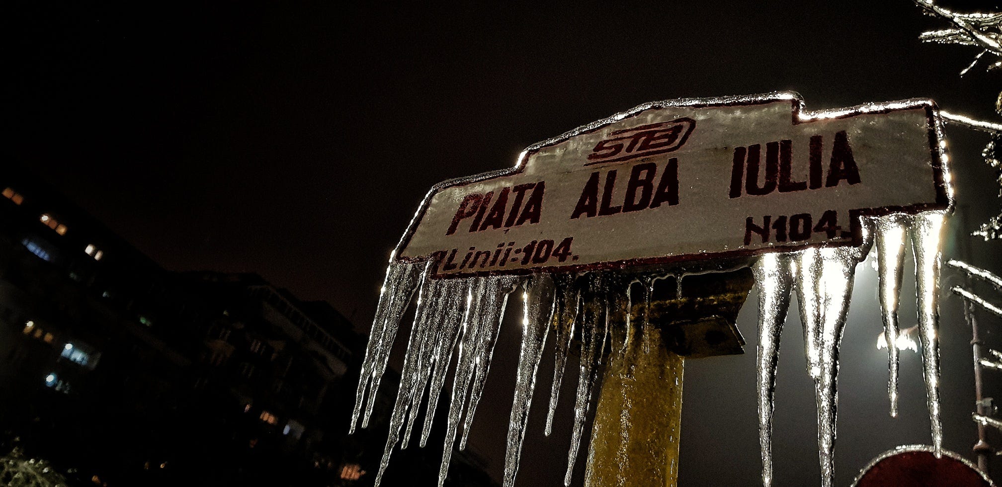 A little ice, some wet asphalt, a few tired apartment blocks, and suddenly the neighborhood begins to look more deliberate than usual — sharper, quieter, faintly theatrical. Light stops merely illuminating things and starts outlining them. A tree becomes a bunch of fireworks. A street sign grows fangs. A hectic boulevard, for a few hours, seems almost composed.